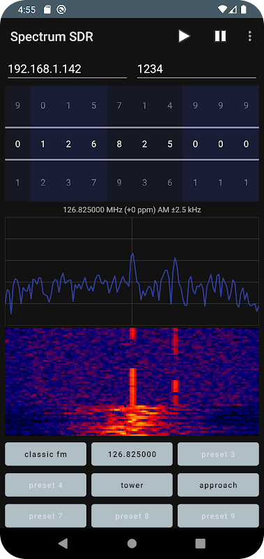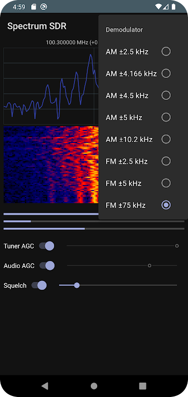 이 애플리케이션을 사용하는 방법은 두 가지입니다. 첫 번째는 RTL-SDR 동글과 Google Play에서 다운로드할 수 있는 SDR 드라이버를 사용하는 것입니다. 애플리케이션 메뉴에서 드라이버 옵션을 선택하면 Google Play에서 드라이버 페이지가 열립니다. 두 번째 방법은 원격 컴퓨터에서 실행 중인 rtl_tcp 인스턴스에 연결하는 것입니다. 대개 Wi-Fi를 통해 연결됩니다. 안정적으로 작동하려면 안정적인 네트워크 연결이 필요하므로 대부분의 경우 드라이버를 사용하는 것이 애플리케이션을 사용하는 가장 좋은 방법일 것입니다.
