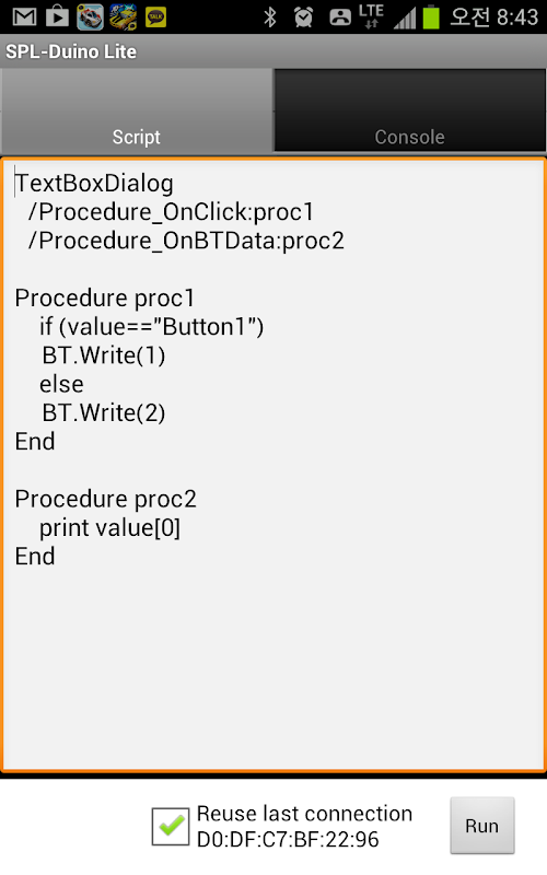 SPL-Duino Lite는 간단한 스크립트를 통해 Button 다이얼로그창, 방향 다이얼로그창, 텍스트 표시창, 방향센서창, 가속센서창, 자기장센서창 등에 사용자의 간단한 로직을 추가하도록 지원합니다.