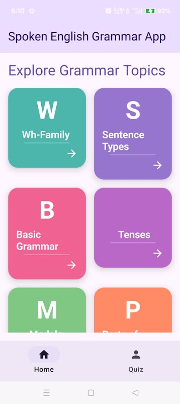 관계절, 연결어, 수동태, 구어체 영어 등 유형별로 분류된 모든 문법 수업을 공부할 수 있습니다. 함께 가는 단어, 형성 단어, 명사, 대명사, 소유격, 전치사, 형용사 및 부사, 현재 시제, 과거 시제, 현재 완료, 미래 형태, 조동사, 조건문, 문장 패턴, 질문, 동사, 보고된 연설.