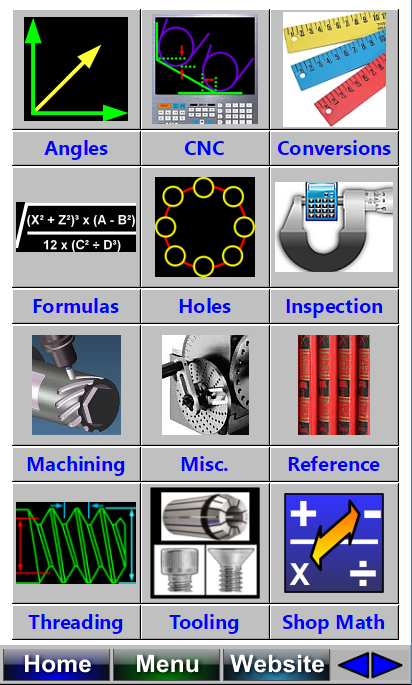 Web Machinist Mobile Pro® has many calculators for CNC Machinists, Programmers and QC Inspectors. Including Calculators for Angles, CNC Applications, Chamfer G-Code Calculators, Metric Conversions, Countersink Depth Calculators, Center Drill Depth Calculators, General Conversions, CNC Drilling, CNC Mill & Lathe Deep Hole Drilling calculators, Blueprint Symbols, G Codes, M Codes, Machining Formulas and calculators, Spindle speed and feed rate formulas and calculators, circle solving formulas, Hole Patterns, Hole Array Patters including full circle and partial circle patterns, 3 Wire Threads Pitch Diameter Measuring Calculators for Unified Threads, Metric Threads, Acme Threads and Metric Trapezoidal Threads, CNC Lathe Tool Nose Radius compensation calculators, QC Inspection, Manual Machining, Metal Removal Rates, CNC Milling, Reference, Rotary Axis, Speeds & Feeds, Imperial and Module Spur Gear Dimensions Calculators, CNC Tapping, CNC Threading, Manual Lathe Calculators, Unified Threads, Metric Threads, Acme Threads, Metric Trapezoidal Threads, Spur Gears, Module Spur Gears, Imperial Spur Gears, Area Calculators, Triangles, Circle Calculators, Mill Machine Tooling, Collets dimensions, Keyseat Cutters Calculators, Trigonometry Calculators, Hole Pattern Calculators, Wheel Bolt Pattern Calculators, Manual Mill Calculators, Tooling & Hardware, Sine Bar and Compound Sine Plate calculators, Trigonometry & Geometry, Shop Math Calculators, Lathe Spindle Speed Calculators, CNC Tapping Speeds Calculators, Drilling Speeds Calculators, Tapping Speeds Calculators, CNC Turning and Miscellaneous Calculators. This is a Must Have APP for Machinists, CNC Machinists, Machine Shops, QC Inspectors, CNC Set-up Operators, CNC Programmers.