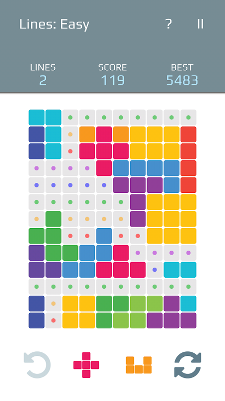 게임 분야에 장소 수치는 같은 색 (사각형)로 표시된 장소를 채우기 위해. 당신이 사각형을 채울 때 새로운 그림을위한 공간을 만들기 위해 삭제, 당신은 점수 포인트를 적립됩니다. 큰 사각형을 삭제하는 것은 더 많은 포인트를 제공합니다. 다음 그림을 넣을 수있는 공간이 될 때까지 게임은 계속됩니다. 잘못된 움직임을 만들어? 이 사각형의 지우기 주도하지 않는 한 마지막 움직임은 취소 할 수 있습니다.