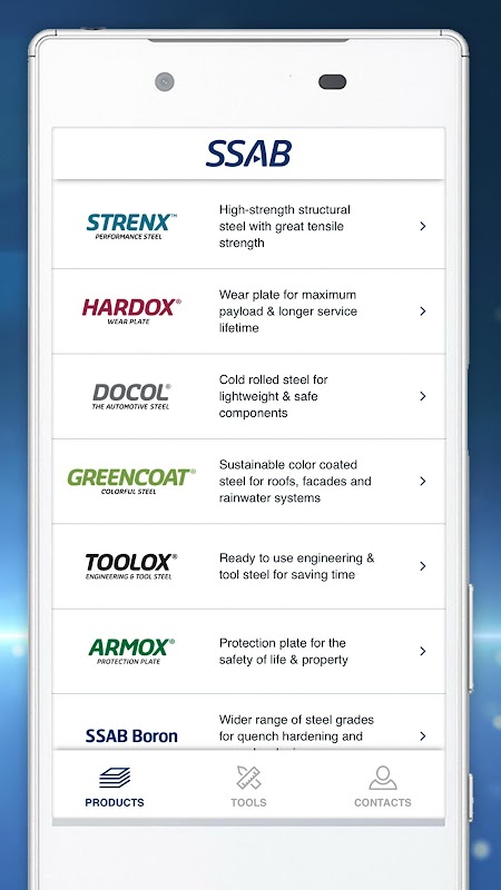 SSAB 응용 프로그램은 SSAB의 다음 철강 제품에 대한 제품 및 연락처 정보를 제공합니다.