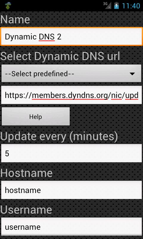 - For every dynamic DNS updater set the name, timeout (in minutes), hostname, username, password and whether to update with the local or public IP address, start the Dynamic DNS Updater when connected to a specific WIFI network, update on connectivity change, start on boot