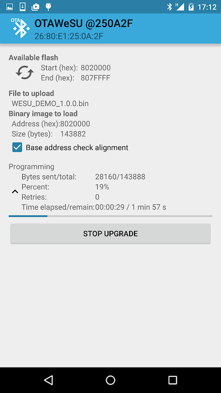 ST BlueDFU은 BLE 연결을 통해 WeSU 펌웨어의 OTA 업그레이드를 관리