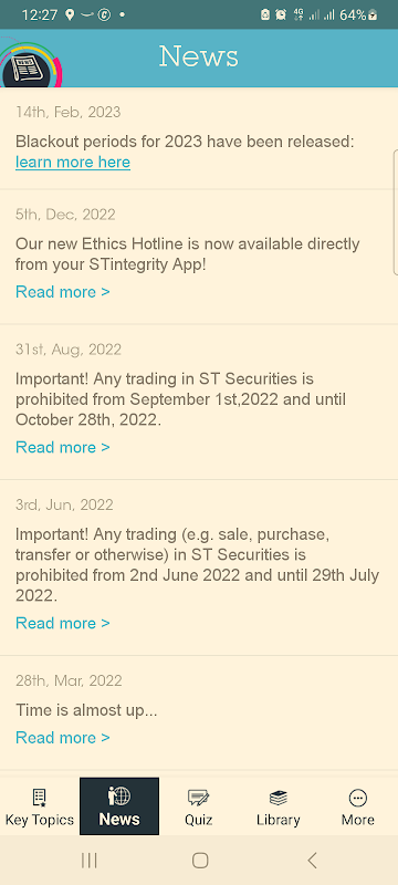 당사의 규정 준수 및 윤리 부서는 STMicroelectronics의 모든 직원이 행동 강령에 포함된 주요 주제에 대한 유용한 정보와 리소스에 쉽게 액세스할 수 있도록 ST Integrity 앱을 개발했습니다. 또한 ST Integrity 앱을 통해 ST 직원은 짧은 퀴즈로 자신의 지식을 테스트하고 규정 준수 및 윤리 분야의 최신 뉴스 및 개발 정보를 확인할 수 있습니다. 또한 보고해야 하는 사람들을 위해 부정 행위 보고 핫라인에 쉽게 액세스할 수 있습니다.