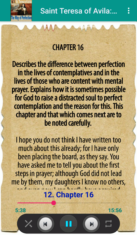 아빌라의 성 테레사의 "완벽의 길"의 전체 장은 대본이 포함된 오프라인 오디오로 제공됩니다. 아빌라의 성 테레사의 오디오북: 완벽의 길. 유럽 개혁 기간 동안 기도에 관한 자신의 경험을 바탕으로 한 예수의 성녀 데레사의 조언.