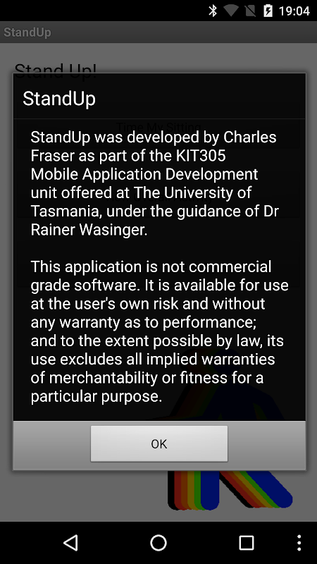 스탠드 업이 박사 라이너 Wasinger의지도하에, 2014 년 태즈 메이 니아 대학에서 제공하는 KIT305 모바일 응용 프로그램 개발 단위의 일환으로 찰스 프레이저에 의해 개발되었다.