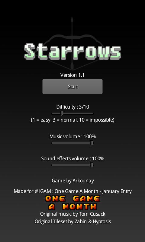Starrows는 # 1GAM (OneGameAMonth) 2013 도전 과제로 제작되었습니다. 1 월 출품작으로 제출되었습니다.