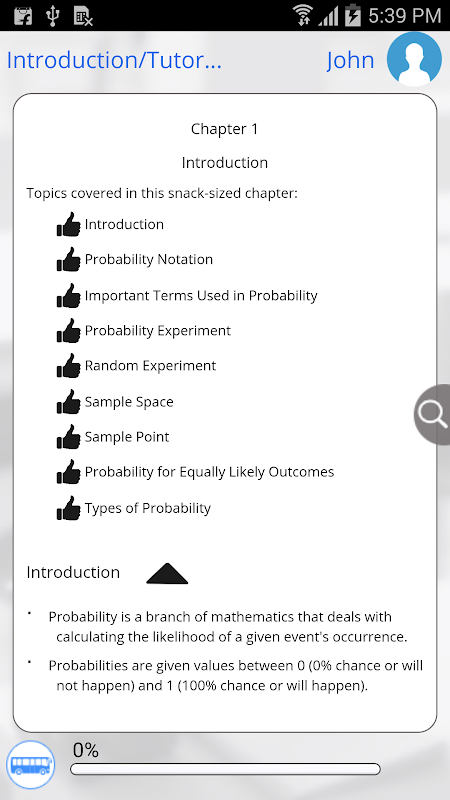 You have limited access to the content provided. For full access to the content, please login and purchase this application. This app provides a quick summary of essential concepts in Statistics and Probability by following snack sized chapters: