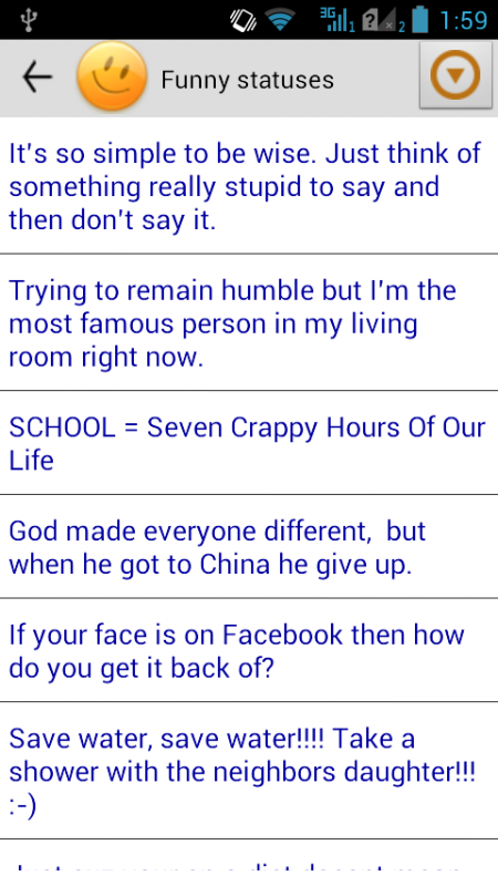 우리의 응용 프로그램에서는 Facebook, Twitter, VKontakte와 같은 타사 응용 프로그램에서 상태를 찾고 공유 할 수 있으며 WhatsApp, 텍스트 편집기 또는 SMS 전송 응용 프로그램에서 사용할 수 있습니다.
