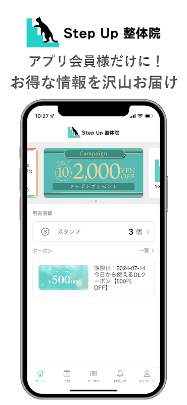 앱을 통해 Step Up 정체원의 신착 정보나 유익한 정보를 받을 수 있습니다. 또, 언제라도 수중의 스마트 폰으로부터, 메뉴나 희망의 시간대의 체크・예약등이 가능합니다. 앱을 설치하여 Step Up 정체원을 보다 편리하게 가까이 이용하실 수 있습니다.