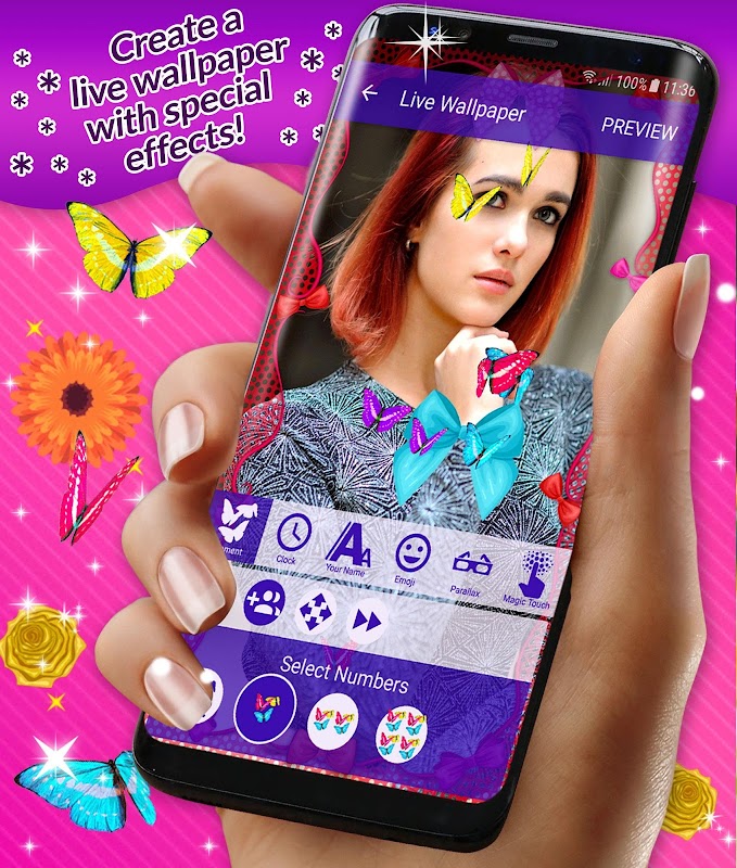 🌸 Create and apply a stunning live wallpaper with moving flowers, butterflies or stars, magic touch, analog clocks and more!