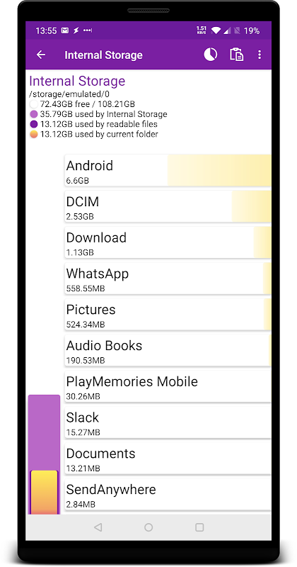 Storage Analyzer는 휴대폰이나 태블릿에서 사용되는 공간을 시각화하고 관리하는 데 도움이 되는 도구입니다. 정보는 귀하의 공간이 어디로 갔는지 쉽게 이해할 수 있도록 간단한 방식으로 제공됩니다.