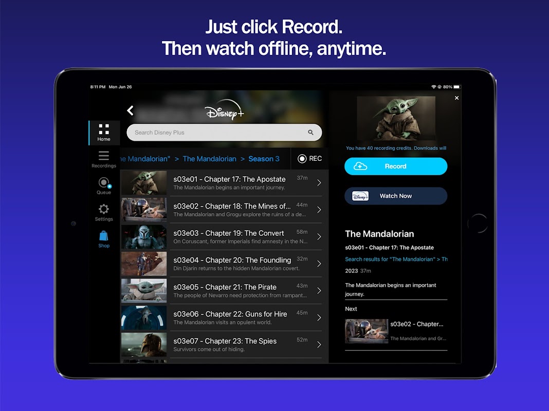 Netflix, Hulu, Amazon, Disney+(Disney Plus), The CW, HBO Max, Peacock, Paramount+, Discovery+, Showtime, STARZ, CBS, NBC, ABC, FOX, PBS, Pluto에서 스트리밍 비디오 녹화, 다운로드 및 광고 건너뛰기 , Tubi, Vudu, Acorn 등. PlayOn Cloud 다운로드는 만료되지 않습니다. 시청할 때 자동으로 광고를 건너뛸 수 있습니다. Netflix에서 동영상을 녹화 및 다운로드한 후 오프라인으로 전환한 다음 Netflix에서 삭제된 후에도 언제 어디서나 시청할 수 있습니다. Netflix에서 다운로드할 수 있는 비디오만 선택할 필요가 없습니다. PlayOn Cloud를 사용하면 모든 Netflix 또는 Hulu 비디오를 다운로드할 수 있습니다. 광고와 함께 HBO Max 비디오를 녹화하고 시청할 때 광고를 건너뜁니다. Disney+ 비디오를 녹화하고 다운로드하여 오프라인에서 시청하세요. 왕좌의 게임, Jack Ryan을 사랑하거나 오프라인일 때 Star Trek: Picard를 보고 싶습니까? 원하는 프로그램이나 영화를 선택하고 녹화를 누르기만 하면 됩니다. 녹화가 완료되면 스트리밍 쇼나 영화를 모바일 장치나 PC에 다운로드할 수 있습니다. 녹화가 완료되는 즉시 휴대폰, 태블릿 또는 Android TV에 자동으로 다운로드하도록 설정할 수도 있습니다. Roku, Chromecast, Fire TV, Apple TV 또는 Android TV에서 녹화를 시청할 수 있습니다. 무엇보다도 녹음이 클라우드에서 이루어지므로 데이터가 사용되지 않습니다.