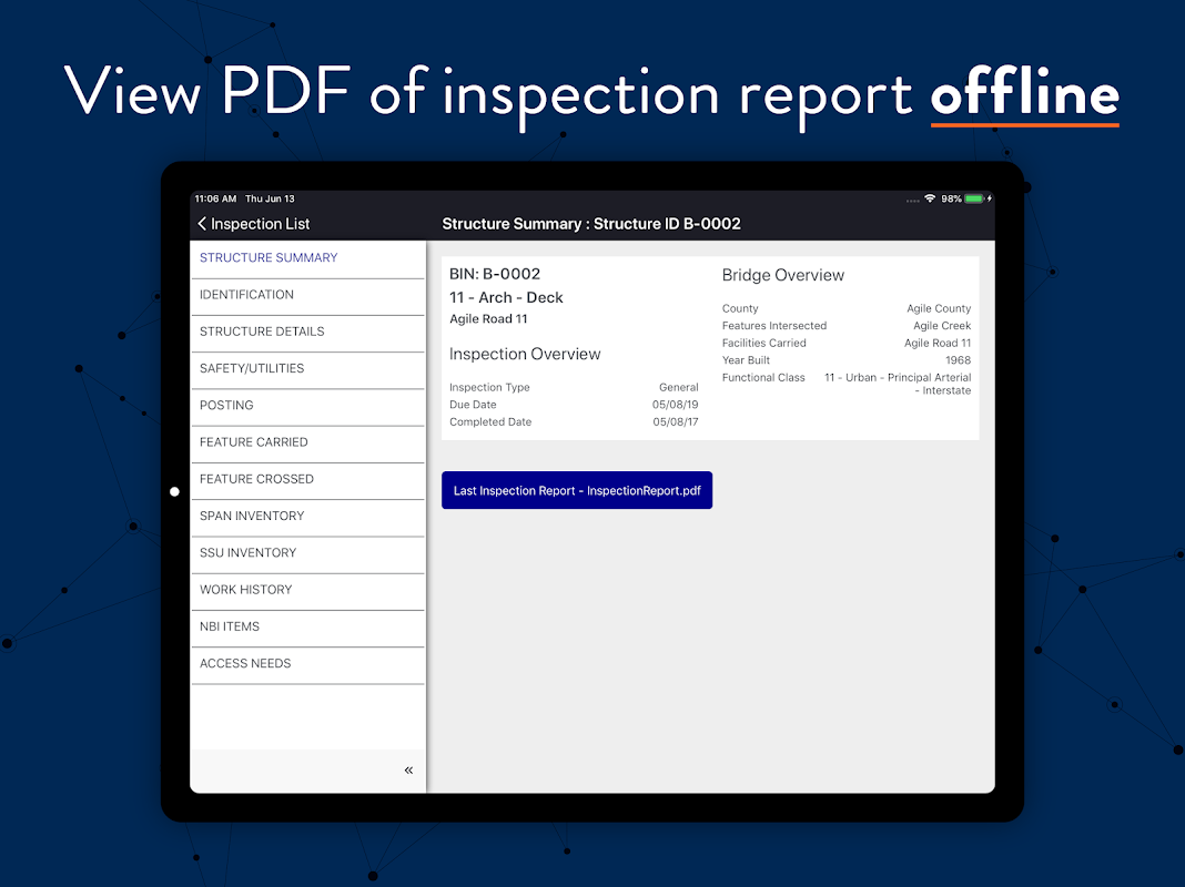 이 동반 모바일 애플리케이션은 AgileAssets® Structures Inspector ™ 웹 솔루션의 기능을 이동중인 팀으로 확장하여 교량, 암거 및 관련 구조물에 대한 전체 검사 프로세스를 지원합니다. 이 응용 프로그램을 사용하여 오류를 제거하고 데이터를 다시 입력하고 현장으로 반복해서 이동하여 워크 플로를 단순화하고 효율성을 향상시켜 시간과 비용을 절약 할 수 있습니다.