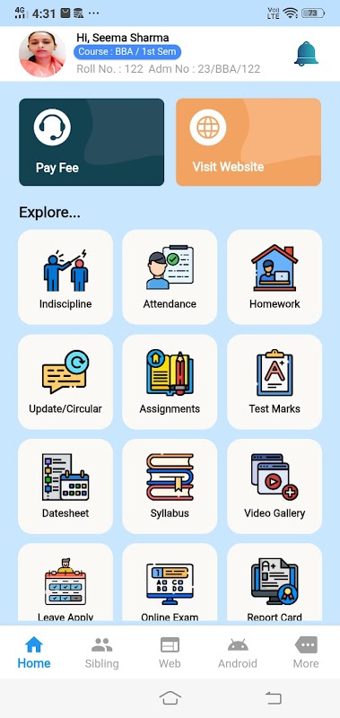 학생 모바일 애플리케이션을 사용하면 학부모는 일일 및 전날 숙제, 출석, 공지 사항, 회보, 징계 세부 사항, 대학 사진 갤러리, 우편함과 같은 와드의 학업 세부 정보에 액세스할 수 있습니다(사용자가 상호 작용할 수 있음). 대학/연구소 행정관과 직접 연락).