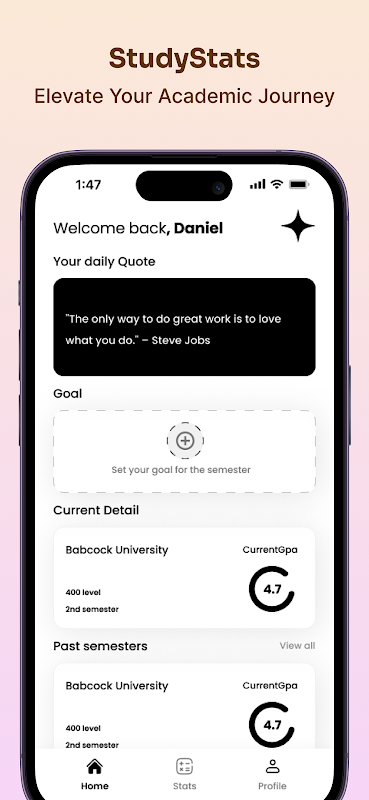 - 목표 설정: 큰 꿈을 꾸고 학업 목표를 설정하세요! Study Stats는 매 학기마다 명확하고 달성 가능한 GPA 목표를 정의하여 동기를 부여하고 올바른 방향으로 나아갈 수 있도록 도와줍니다.
