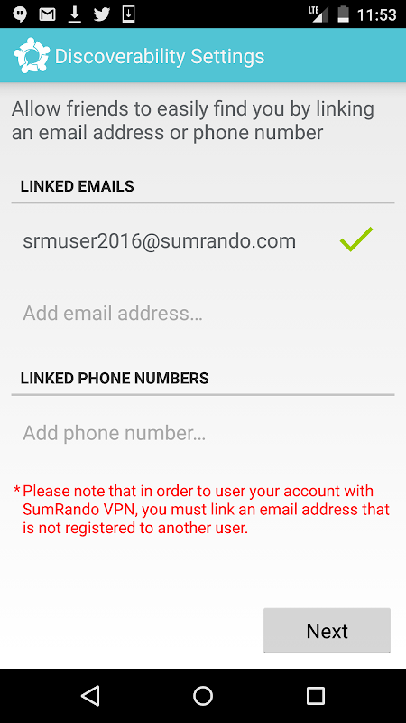 - The ability to link your account to your phone number or email address to make it easier for other SumRando Messenger users easier to find you. BUT there is no mandatory link between your phone number and/or email address!