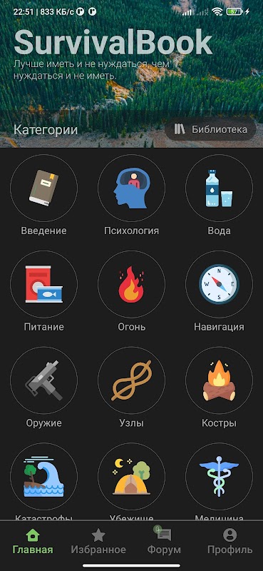 Survival Book 응용 프로그램은 여행자, 관광객 및 생존 주의자의 주요 조수입니다. 이러한 그룹에 속하지 않더라도 서바이벌 북은 간단한 자연 여행에 유용할 것입니다. 편리한 라이브러리 덕분에 관심 있는 섹션만 다운로드할 수 있으며 이후에는 오프라인 액세스가 가능합니다.