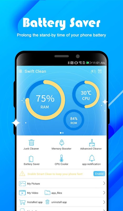 It's a green app that anyone can enjoy on their phone.Swift Clean helps you quickly scan moving systems and Clean system caches and garbage files with a simple touch.Check battery status and save battery in real time, extend battery life!