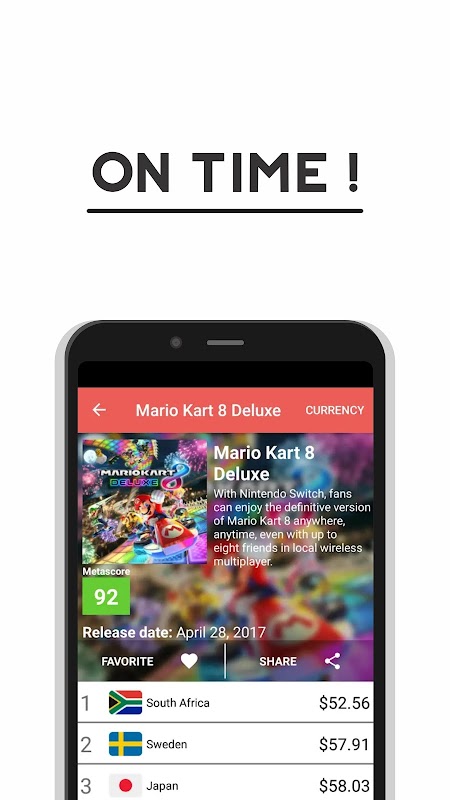 The app tracks the lowest price of Nintendo Switch games in the Nintendo eshop. The list of games by price allows you to know the best price, the new games release and the trend of the promotions of the games Switch.
