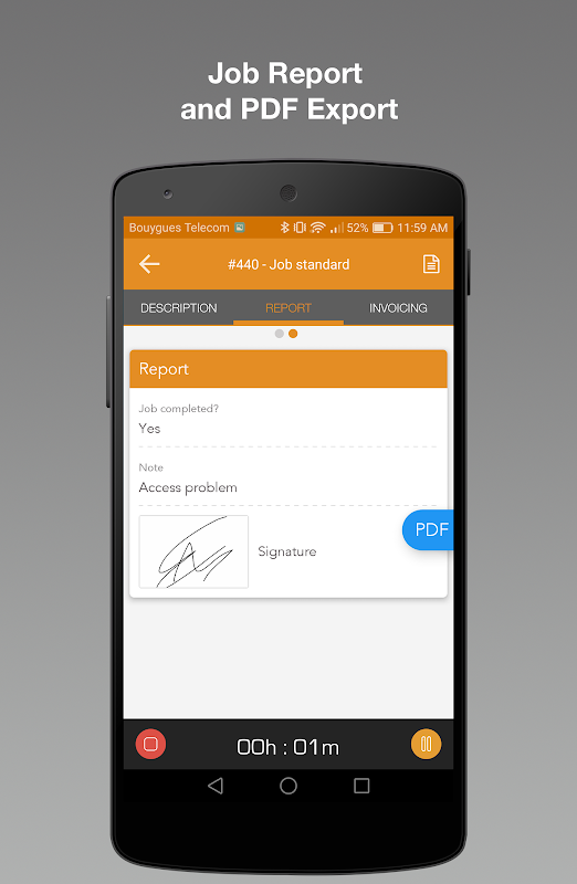 최대 자율성 : 이전 작업 주문을 검토합니다. 작업 생성, 일정 변경 또는 거부. 작업 또는 고객과 연결된 첨부 파일에 액세스합니다. 자동 동기화 및 GPS 추적을 활성화/비활성화합니다.