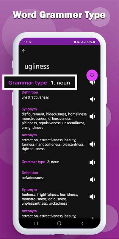 이 영어 동의어 및 반의어에는 영국 및 미국 악센트의 발음을 갖춘 문법 유형, 의미, 정의, 동의어 및 반의어가 포함된 가장 큰 단어 컬렉션이 포함되어 있습니다. 이 광범위한 용어 컬렉션은 원어민 및 영어를 배우고자 하는 사람들을 위한 신뢰할 수 있는 도구입니다.