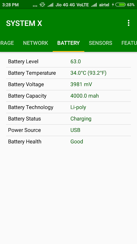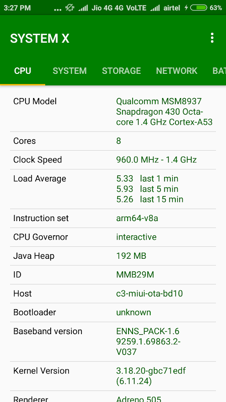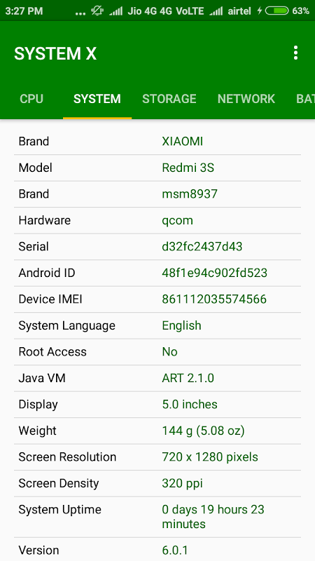 시스템 X 등 프로세서 코어 속도 모델, RAM, 카메라, 센서, 배터리, 저장 장치와 같은 소프트웨어 및 하드웨어 정보를 표시