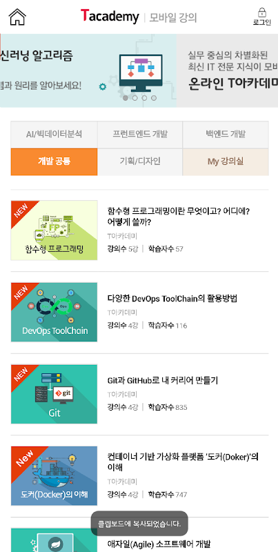 토크온, 인공지능, 알고리즘 등 IT분야 다양한 온라인강의를 언제 어디서나 스마트폰으로 학습할 수 있습니다.