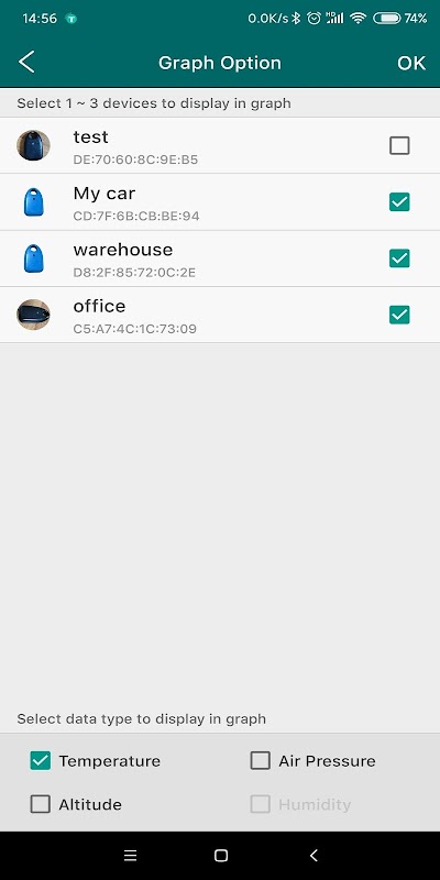 온도, 습도, 기압, 고도와 같은 주변 T-센서 값을 표시합니다. 앱은 즉각적인 센서 데이터를 얻기 위해 항상 장치와 블루투스 연결을 유지합니다. 사진을 찍어 장치 아바타를 변경할 수 있습니다. 센서 데이터는 앱에 저장되며 Excel 파일을 내보내 다른 장치와 공유할 수 있습니다.