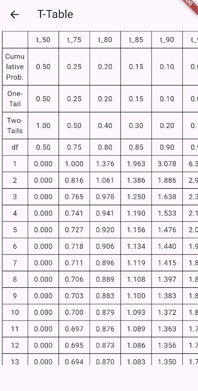 학생, 교육자, 연구원을 위해 설계된 T-Table 앱으로 통계 분석의 잠재력을 활용해 보세요. 통계를 공부하든, 연구를 수행하든, 학생의 T-Table 점수에 대한 빠른 참조가 필요한 경우, 이 앱은 신뢰할 수 있는 솔루션을 제공합니다.