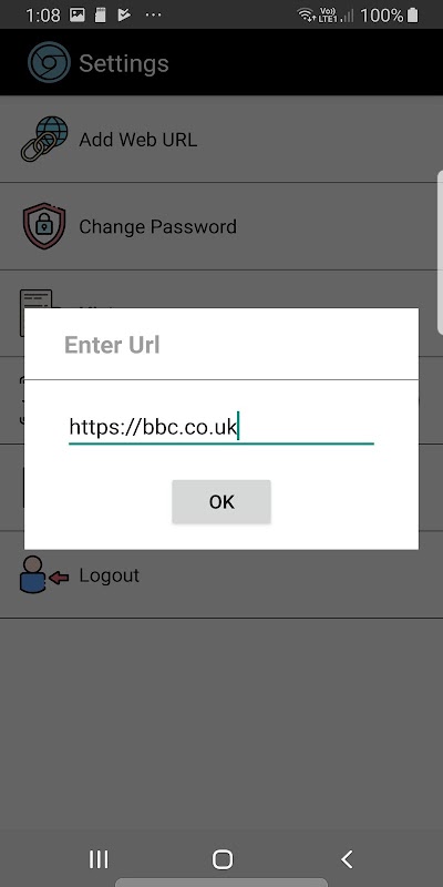 Lockdown any Browser URL in a KIOSK MODE. End user will have limited access to webpages. Device users cannot access android settings and other applications on the device.