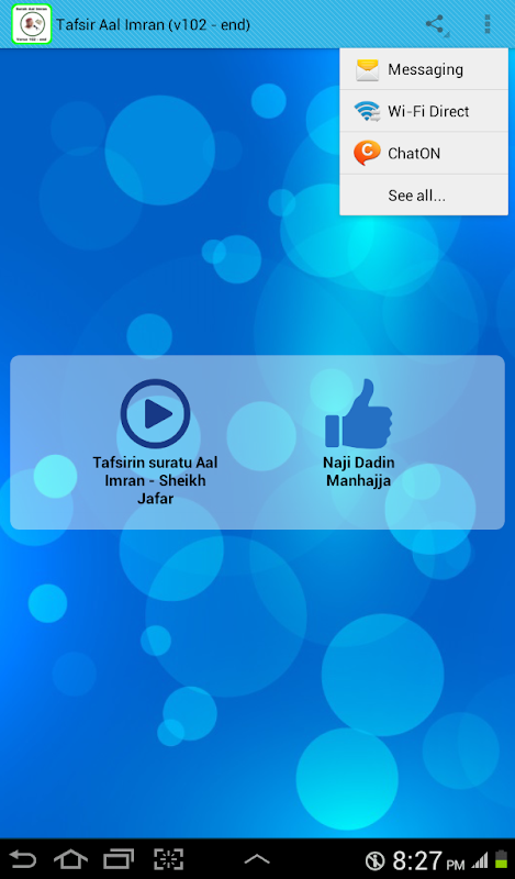Wannan manhajja na aiki ba tare da an kunna data ba. Akwai app mai dauke da tafsir daga ayah ta daya zuwa ayah ta dari da daya. Duba Tafsir Aal Imran (v01 - 101) cikin wannan gida domin samunsa.