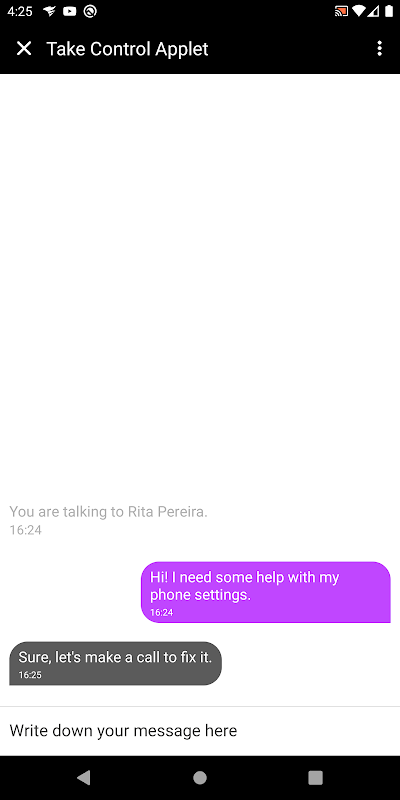 이 응용 프로그램은 지원 IT 지원 기술자의 원격 액세스 솔루션과 함께 작동하며 장치에 연결하고 발생할 수있는 기술 문제를 해결할 수 있습니다. 기술자는 SolarWinds® Take Control ™ 원격 지원 소프트웨어를 사용하고 있으며이 애플릿은 해당 솔루션과 함께 작동하여 기술자가 장비에 매우 안전하게 직접 연결할 수 있습니다.