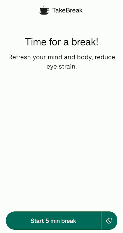 ⏰ 맞춤형 휴식: 필요에 맞게 휴식 일정을 맞춤화하세요. 짧고 빈번한 휴식을 선호하든, 더 긴 간격을 선호하든 TakeBreak를 사용하면 휴식 기간과 빈도를 맞춤 설정할 수 있습니다.