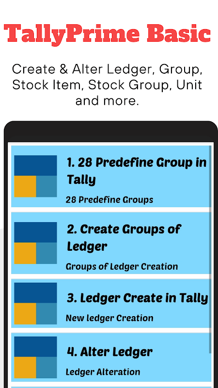 회계와 Tallyprime 앱에 관련된 많은 내용을 배울 수 있는 Tally 교육용 앱입니다.