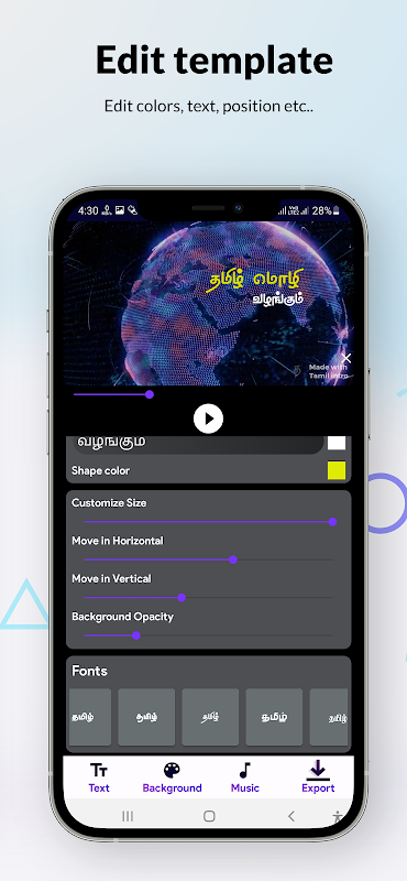 정밀하게 개인화하세요: 콘텐츠를 입력하고, 색상을 조정하고, 텍스처를 적용하고, 50개 이상의 다양한 타밀어 글꼴 중에서 선택하세요.