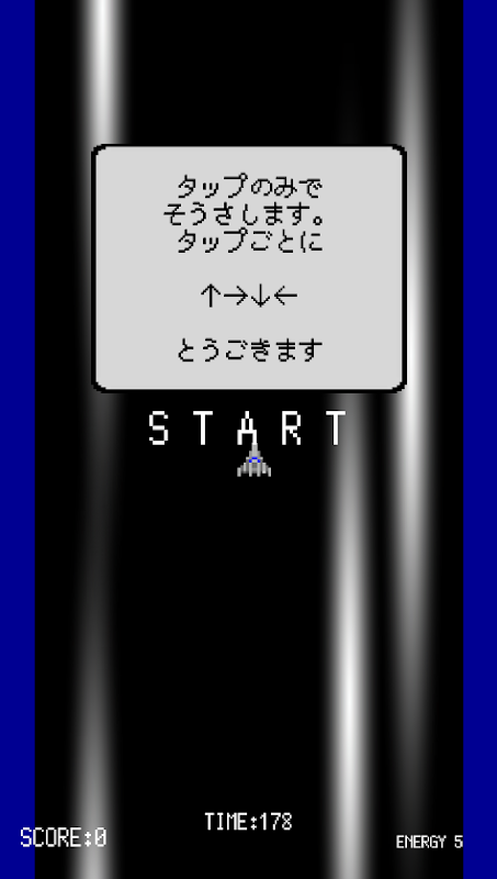 縦シューティングゲームです。タップするごとに↑→↓←と動きます。