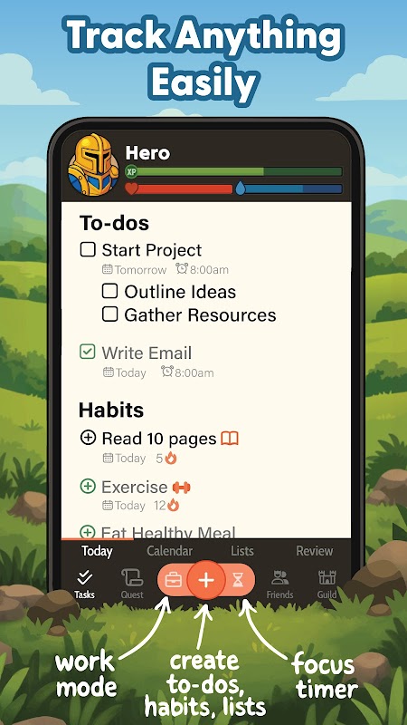 친구와 함께 퀘스트에 참여하고, 서로를 치료하고, 보호하고, 강화하세요. 놓친 작업이나 습관은 동료에게 해를 끼칠 수 있음을 기억하십시오!