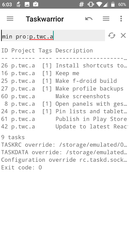 Taskwarrior의 안드로이드 맛의 다음 버전 - 콘솔 작업 관리 도구