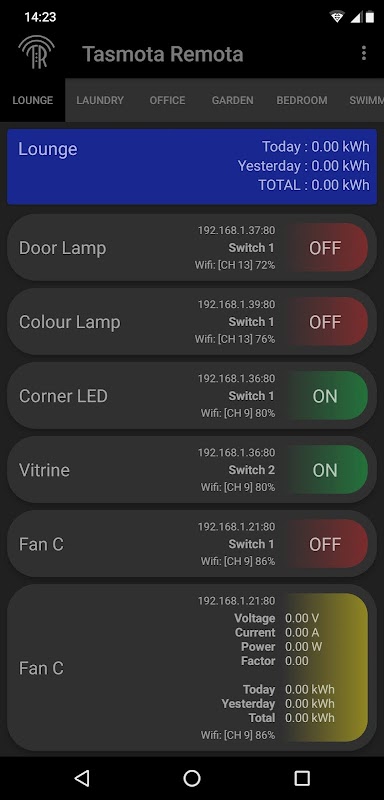 각 장치는 물리적 Tasmota 장치의 릴레이, 스위치 또는 센서를 나타냅니다. 기기에 여러 개의 릴레이, 스위치 또는 센서가 있는 경우 TasmotaRemota에 개별 "기기"로 나열됩니다.