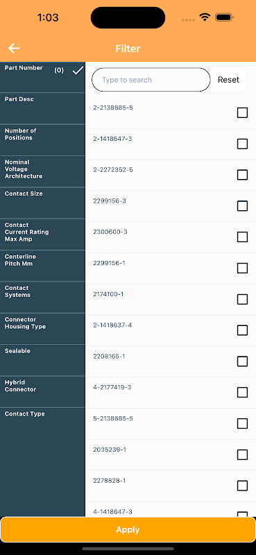 TE Product Explorer는 휴대폰 및 태블릿 버전 모두에서 사용할 수 있으며 터미널, 헤더, 커넥터, 데이터 연결 및 E-Mobility와 같은 상품의 모든 부분에 대한 기술 정보를 제공합니다. 사용자는 즐겨찾기에 저장하고 모든 세부 사항을 볼 수 있으며 부품 이미지, 기술 사양을 Excel 파일 형식으로 다운로드할 수 있습니다. 사용자는 적용하여 부품을 필터링할 수 있습니다.