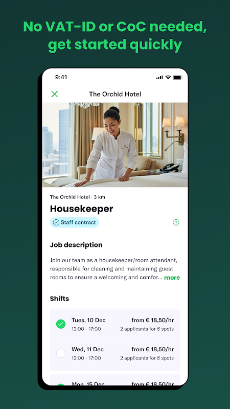 유연성과 보안이 동시에 유지되는 새로운 작업 방식을 찾아보세요. 각 교대근무에 대한 임시 고용 계약을 통해 관심 있는 클라이언트를 위해 원하는 만큼 일하십시오. CoC 등록에는 VAT 번호가 필요하지 않습니다. 그냥 일하고 월급 받으세요.