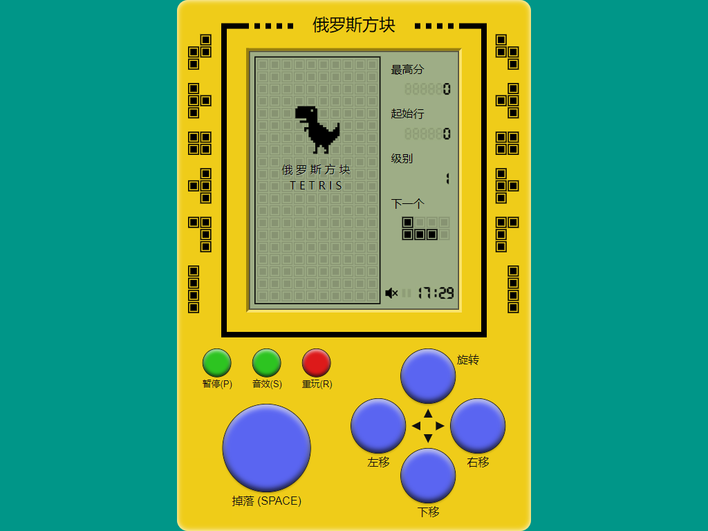 The main elements in the game are different shapes of Tetris composed of four squares, each of which is composed of four small squares, and the shapes include strips, squares, L-shaped, reverse-L-shaped, S-shaped and Z-shaped. These blocks will gradually fall from the top of the game interface, and the player needs to move and rotate the blocks to form a horizontal complete row at the bottom. Once a row is completely filled, the row is cleared and points are awarded. If the cubes pile up to the top of the game interface, the game is over.