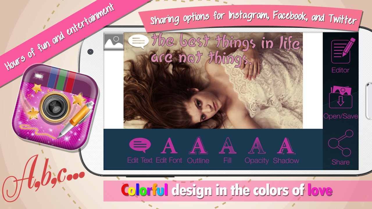 Selfie mania is here, so brace yourself for an amazing text on pics app. If you want to edit your photos with style, download ♣ Text Photo Editor ♣ and add text to pics like never before. The fun starts now!