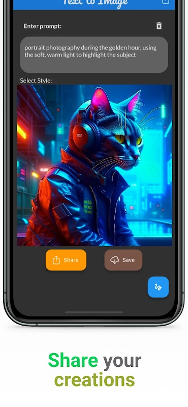 시각적 걸작을 만든 후에는 Text to Image | Art는 이미지를 장치에 직접 다운로드할 수 있는 옵션을 제공합니다. 소셜 미디어 플랫폼, 메시징 앱 또는 친구 및 가족과 창작물을 공유하고 그것을 만나는 사람들에게 기쁨을 가져다주는 것을 목격하십시오.