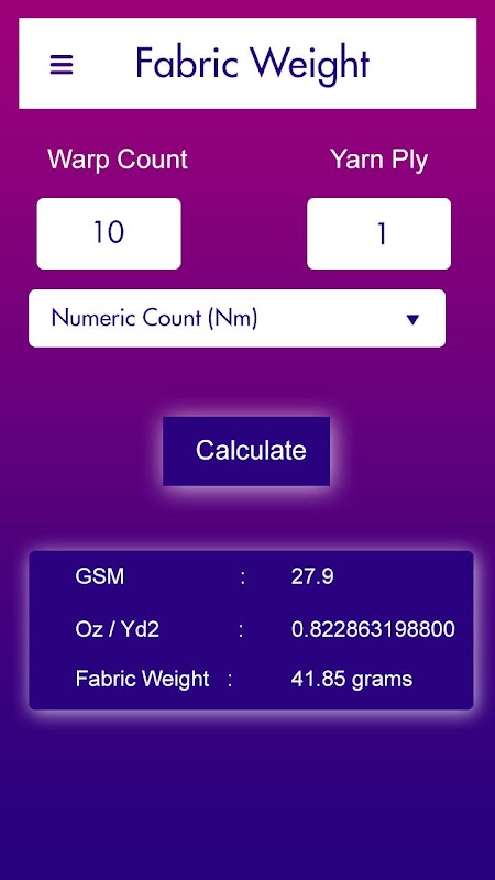 먼저이 "원사 계산기"앱을 설치 한 다음 한 번의 클릭으로 열면 응용 프로그램에 많은 기능이 있음을 알 수 있습니다. 원사 계산을 원한다면 계산 해야하는 옵션을 선택하면됩니다. 원사 계산기 옵션에서 원사를 변환하려면 원사 변환기를 클릭하고 원사 길이를 계산하기 위해 "원사 길이 계산기"를 선택하고 직물의 무게를 계산하기 위해 "직물 무게 계산기"옵션을 선택하고 직물의 GSM을 계산하십시오 "Fabric GSM calculator"를 클릭하십시오. 모든 계산은이 앱인 여러 추천 앱이라고하는 하나의 앱에 있습니다.