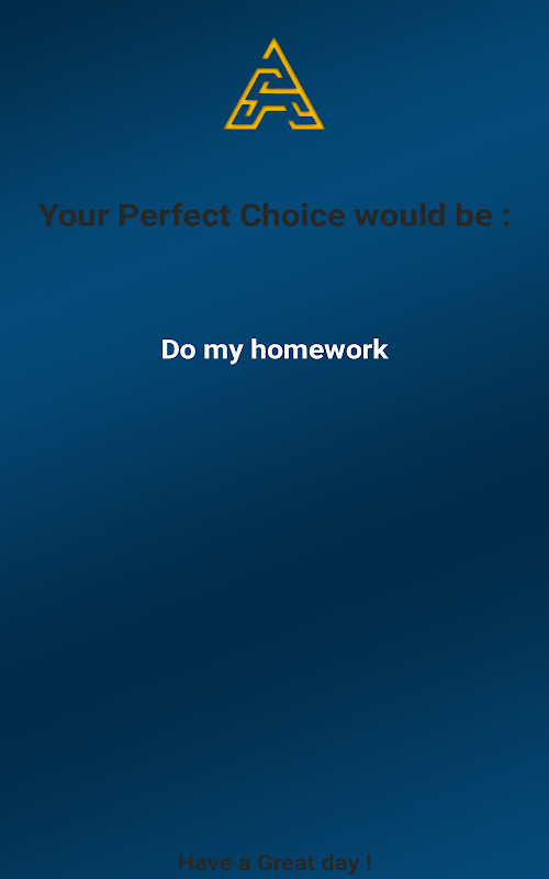 The User just has to type his/her Choice/Decision in the text boxes addressed for that purpose and hit the "What's my Perfect Choice" button ! You will be asked to wait, for your Perfect Choice, for a few seconds (5 seconds) then The App will reveal to you what your best and perfect Choice would be !