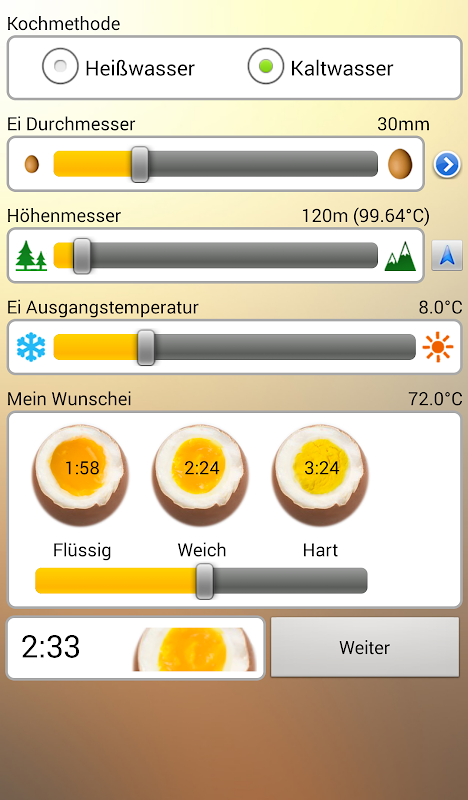 사용법 : 간단하게, 당신의 계란의 정확한 크기를 측정 당신의 안드로이드 전화에 배치하고 귀하의 손가락 끝을 사용하여 크기를 설정하기 위해. 현재 고도를 결정한다 (또는이 GPS에 의해 결정 될 수 있습니다) 당신은 냉장고 또는 상온에서 계란을 유지하는 경우, 안드로이드 - 전화를 말해 계란은하고 싶은 방법 - 삶은 부드러운 삶은 또는 무엇인가 그 사이.