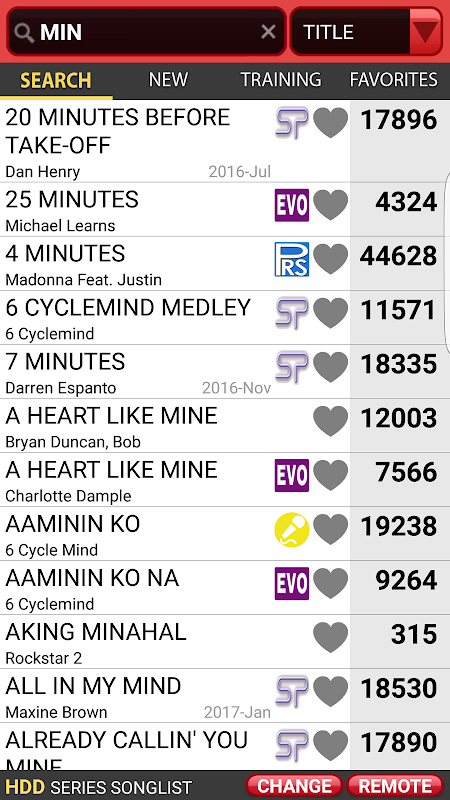- 새로 추가 된 곡을 찾아 (레드 새로운 아이콘 DVD 업데이트를 나타내며, 파랑 새 아이콘은 하드 디스크 타입의 선수를 위해 매달 추가 곡을 의미한다)
